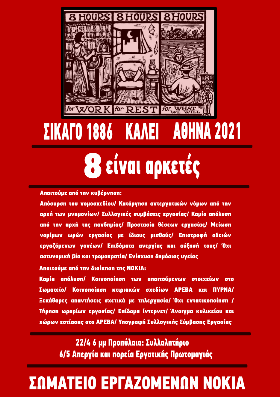 Ήταν Μάιος του 1886 όταν τα σωματεία στην Αμερική ξεκινούν, με επίκεντρο το Σικάγο, μία απεργία που είχε αποφασιστεί 2 χρόνια νωρίτερα, με αίτημα «8ώρες δουλειά – 8ώρες ύπνο – 8ώρες ότι θέλουμε» και με πάνω από 600.000 εργάτες και εργάτριες να κάνουν καταλήψεις σε εργοστάσια και συγκεντρώσεις διαμαρτυρίας.