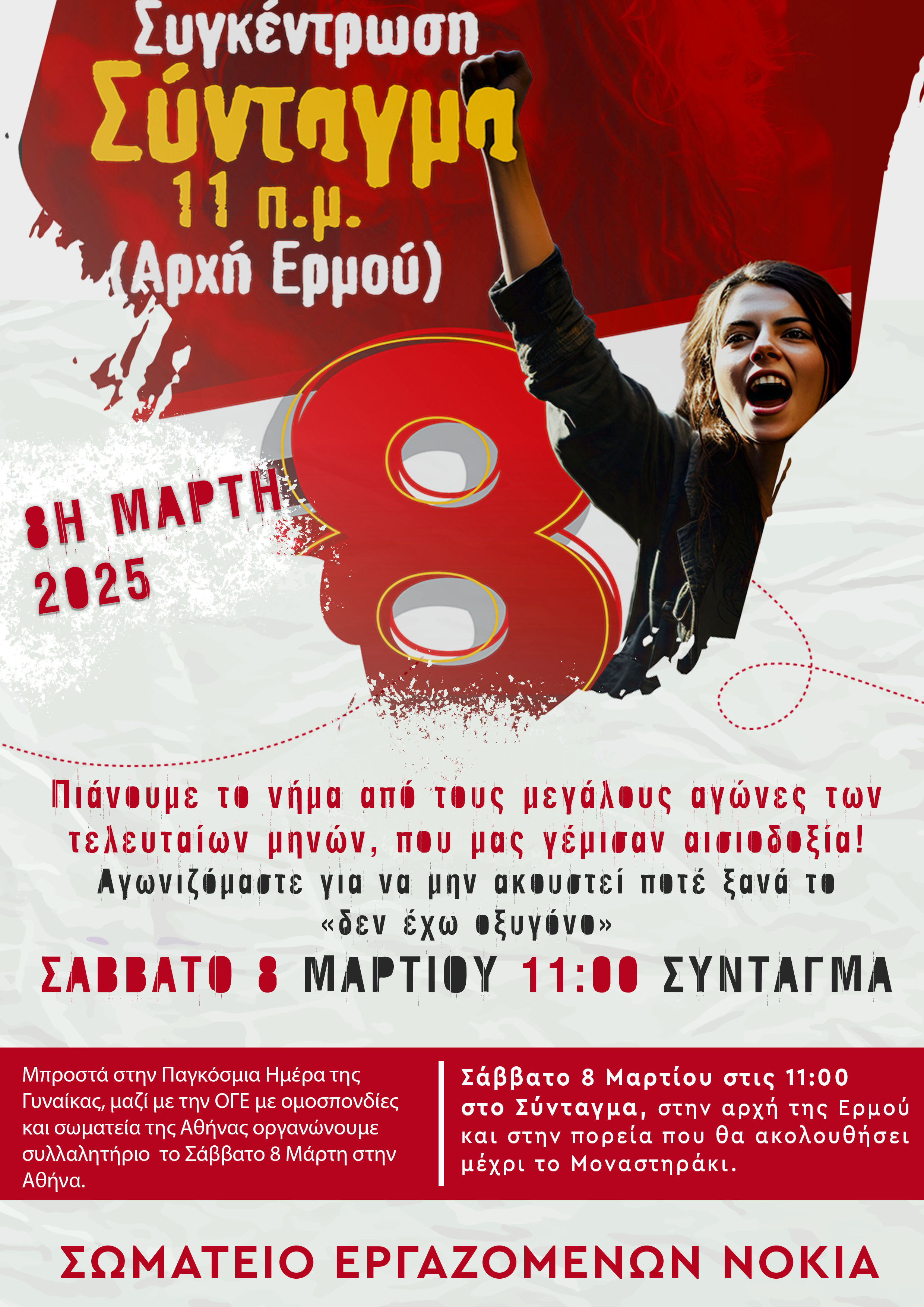 Συμμετέχουμε στη συγκέντρωση της Ομοσπονδίας Γυναικών Ελλάδας (ΟΓΕ) για την 8η Μάρτη Σάββατο 8 Μαρτίου στις 11:00 στο Σύνταγμα, στην αρχή της Ερμού και στην πορεία που θα ακολουθήσει μέχρι το Μοναστηράκι.