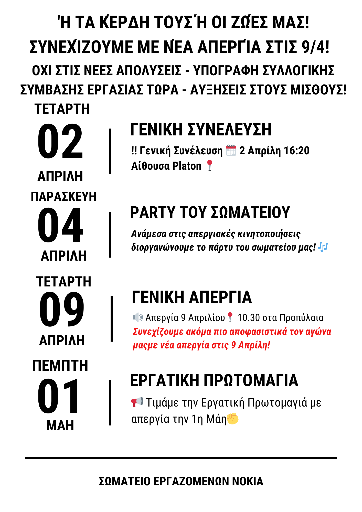 Το Σωματείο Εργαζομένων ΝΟΚΙΑ σας καλεί στη 1η εξ’αναβολής Γενική του Συνέλευση που θα γίνει την Τετάρτη 2 Απρίλη στις 4.30μμ με θέμα συζήτησης: